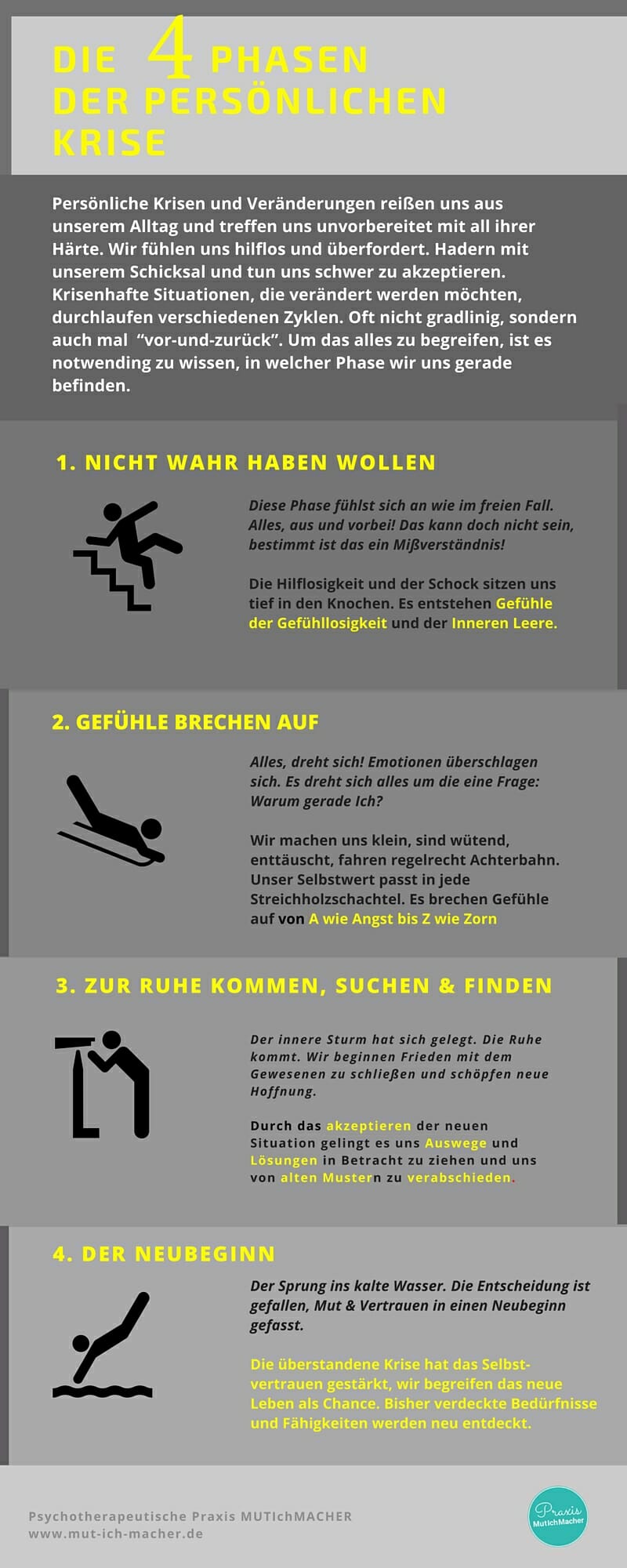 Ohnmacht, Hilflosigkeit, manchmal auch Wut – so fühlt es sich an, wenn eine Krise Einzug in dein Leben hält. Manchmal schleichend, manchmal plötzlich. Dein Leben steht vor einer Veränderung. In dem folgenden Krisenmodell zeige ich dir, welche 4 Krisenphasen du in einer schwierigen Situation durchläufst. Diese Infografik gibt dir eine wertvolle Hilfestellung, um deine Emotionen in jeder Phase zu reflektieren und schnell wieder aus der Krise herauszufinden – vom ersten Schockgefühl bis zum Neubeginn.